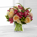 FTD® proudly presents the Better Homes and Gardens® All Aglow™ Bouquet. Light up their life with incredible color and blooming beauty when you send this exquisite flower bouquet. Unforgettable peach roses are surrounded by red Peruvian lilies, pale yellow mini carnations, green hypericum berries, lily grass blades, and lush greens to create a stunning flower arrangement. Presented in a clear glass cube vase to give it a sophisticated look, this mixed flower bouquet will express your sweetest thank you, get well, or congratulations wishes.