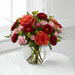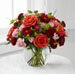 FTD® proudly presents the Better Homes and Gardens™ Color Rush™ Bouquet. A sweet symphony of bold color, this bouquet of orange roses, red matsumoto asters, pale pink mini carnations and lush greens create an impressive statement. Arranged in a clear glass bubble bowl, this bouquet will spread smiles at every turn.
