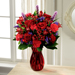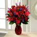Love makes the world go 'round and this fresh flower arrangement is out to prove it with it's deep, romantic coloring and, oh, so sophisticated styling. Rich red roses mingle with red Peruvian Lilies, hot pink carnations, purple statice, red hypericum berries, liatris, and lush greens, elegantly arranged in ruby red glass vase to create an impactive visual affect. Bursting with love from every bloom, this bouquet is out to create a standout anniversary, birthday, or, "I love you," gift. GOOD bouquet includes 22 stems. Approx. 19"H x 12"W. BETTER bouquet includes 26 stems. Approx. 20"H x 14"W. BEST bouquet includes 30 stems. Approx. 21"H x 15"W.