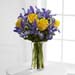 The FTD® Sunlit Treasures™ Bouquet spreads joy and light with its rich display of brilliant color. Deep midnight blue iris set an impressive background to vibrant yellow roses perfectly arranged in a clear glass vase, creating a bouquet of happy wishes for a wonderful Spring season.