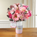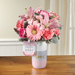 The FTD® Sweet Baby Girl™ Bouquet by Hallmark celebrates the new family with style and grace. Blossoming with light and love, this fresh flower bouquet brings together hot pink roses, pink carnations, pink gerbera daisies, pink mini carnations, pink Asiatic Lilies, and dusty miller stems to create a truly stunning gift. Presented in a keepsake ceramic vase with a pale shade of pink at the bottom, "Love" written in a metallic script font at the dusty gray center, and white on the top, this beautiful bouquet arrives with an exclusive Hallmark tag that reads, "Sweet New Baby," making this a wonderful way to welcome the new baby girl into the world. GOOD bouquet includes 10 stems. Approx. 13"H x 12"W. BETTER bouquet includes 14 stems. Approx. 15"H x 12"W. BEST bouquet includes 17 stems. Approx. 16"H x 13"W.