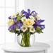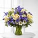 The FTD® Sweet Beginnings™ Bouquet exudes the promise of each day's potential with its unlimited beauty. Deep purple iris mingles with pale yellow roses, white traditional daisies, Queen Anne's Lace and lush greens to create an incredible look. Arranged in a clear glass bubble bowl vase, this bouquet is full of warm wishes and sweet sentiments.