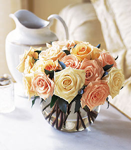 Bouquet-length cream, pink and peach roses with eucalyptus in a glass bubble bowl.